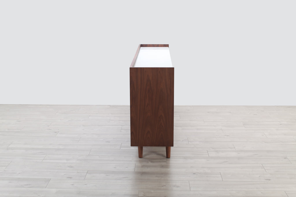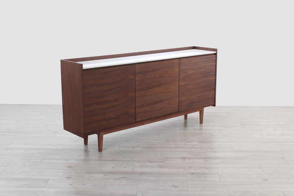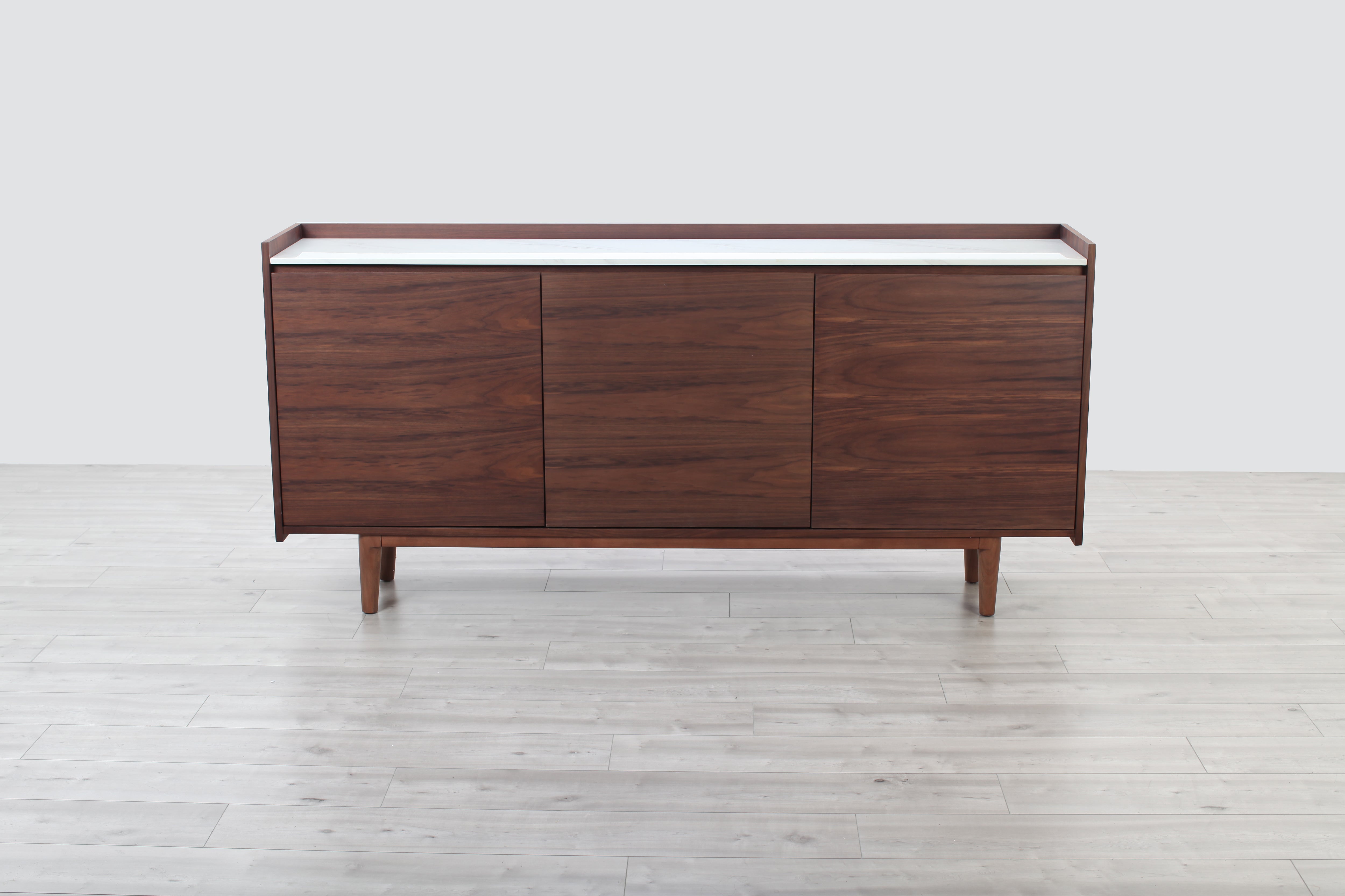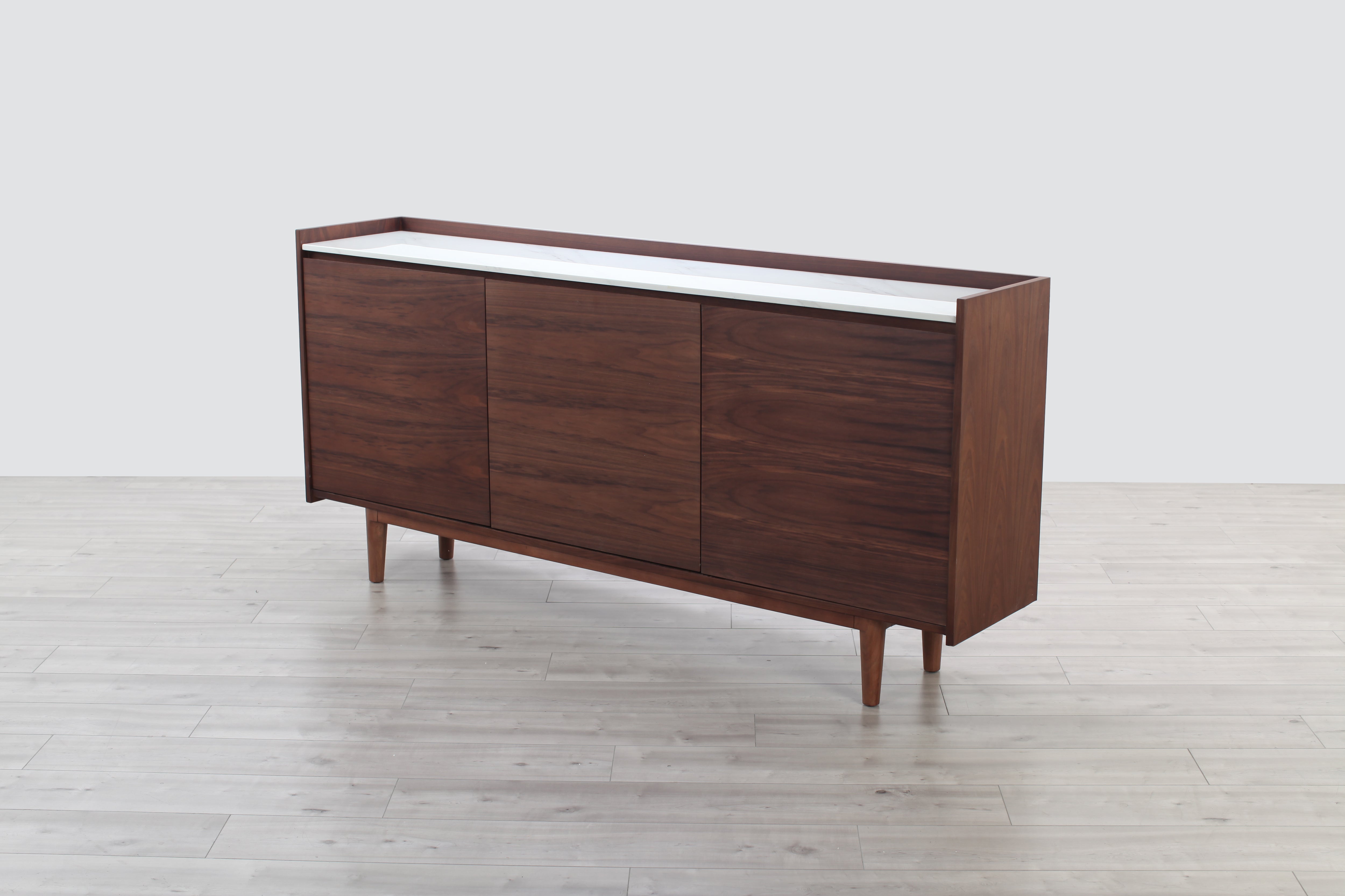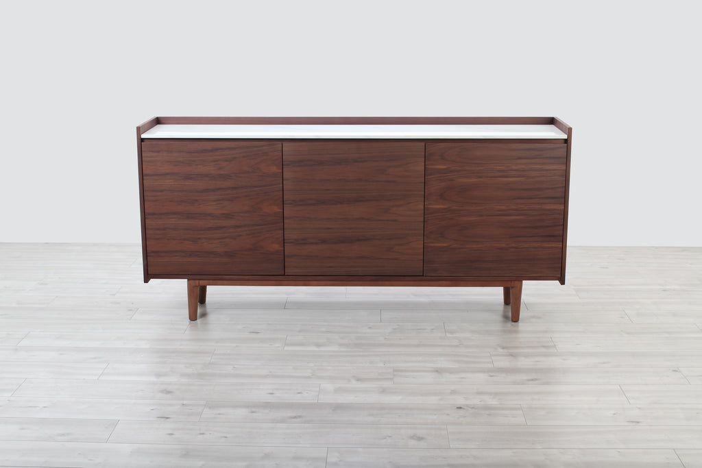 A welcome addition to any mid-century styled home, this sideboard constructed of MDF walnut veneer and equipped with soft closing drawers is the perfect definition of form and function. Ample storage is one thing, but it’s the beautiful solid natural marble top that makes this sideboard a head-turner in any room.