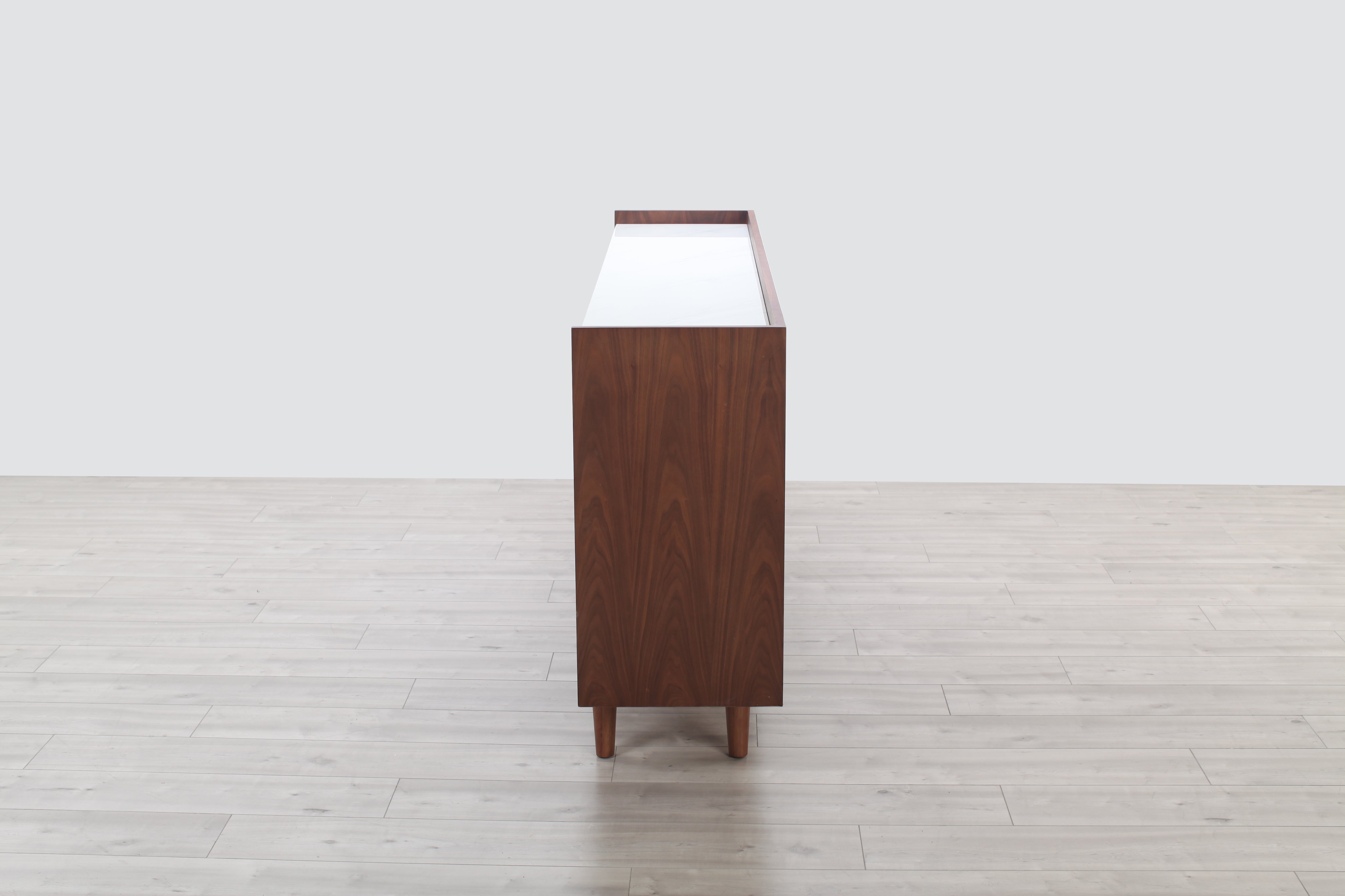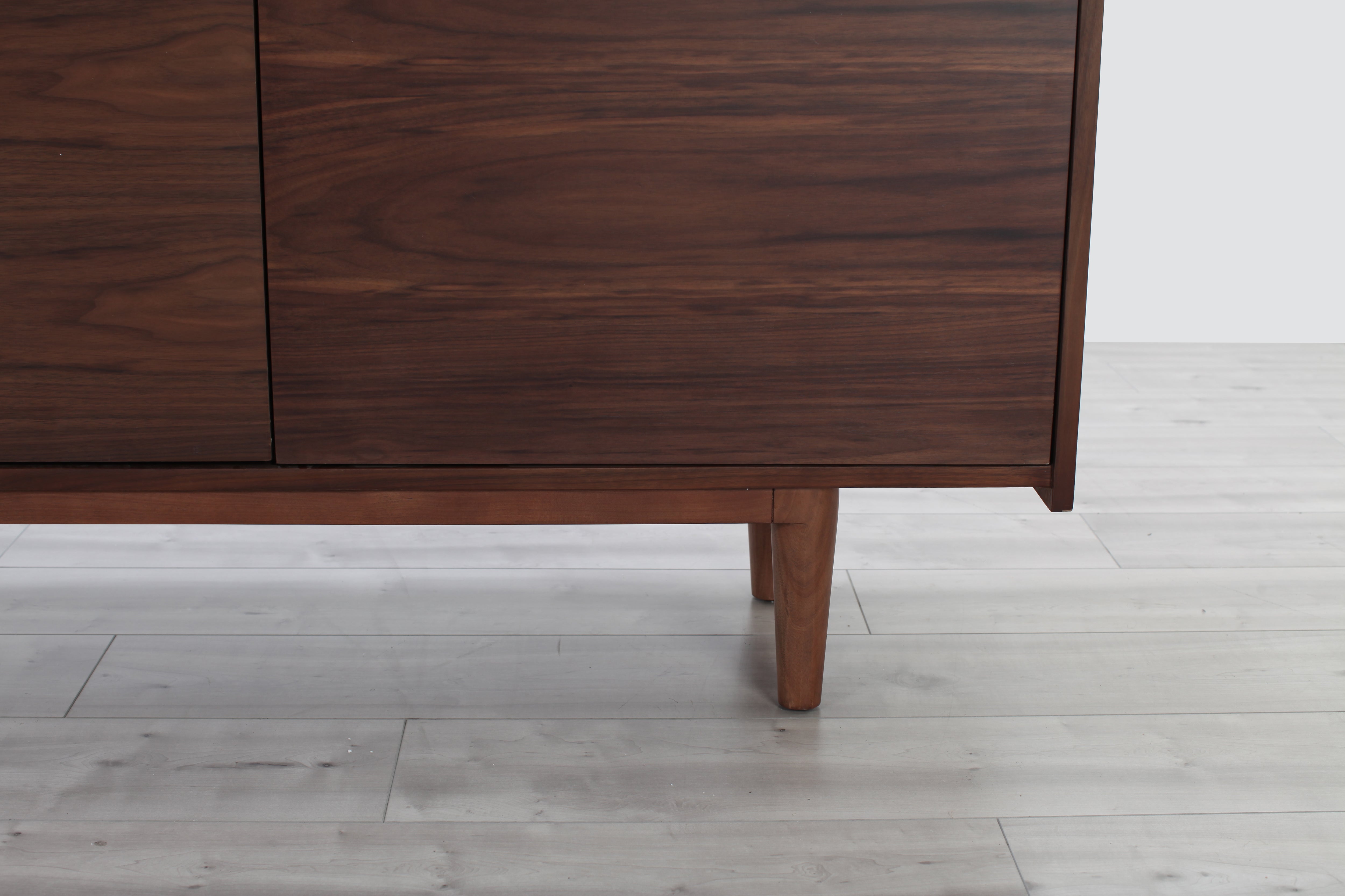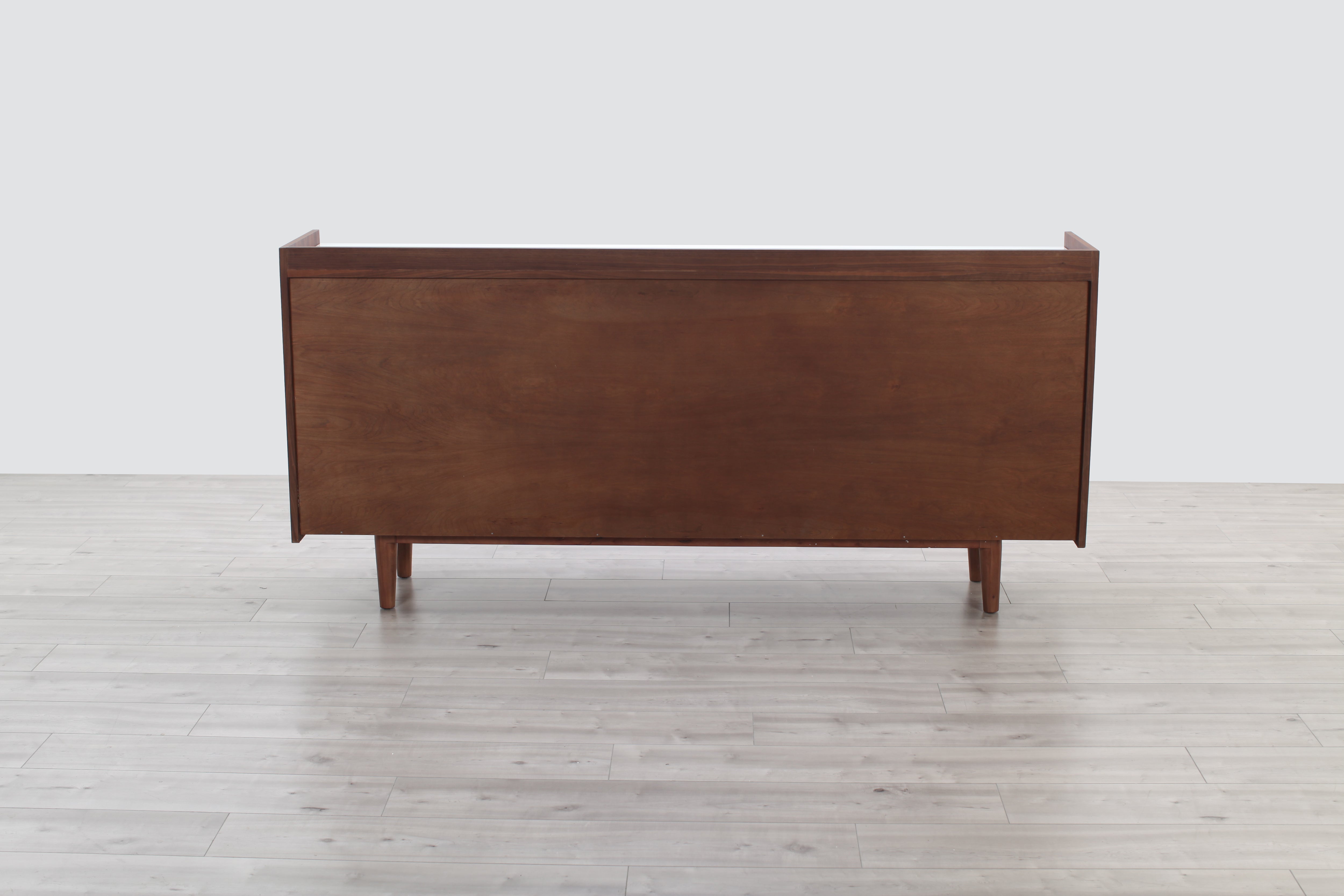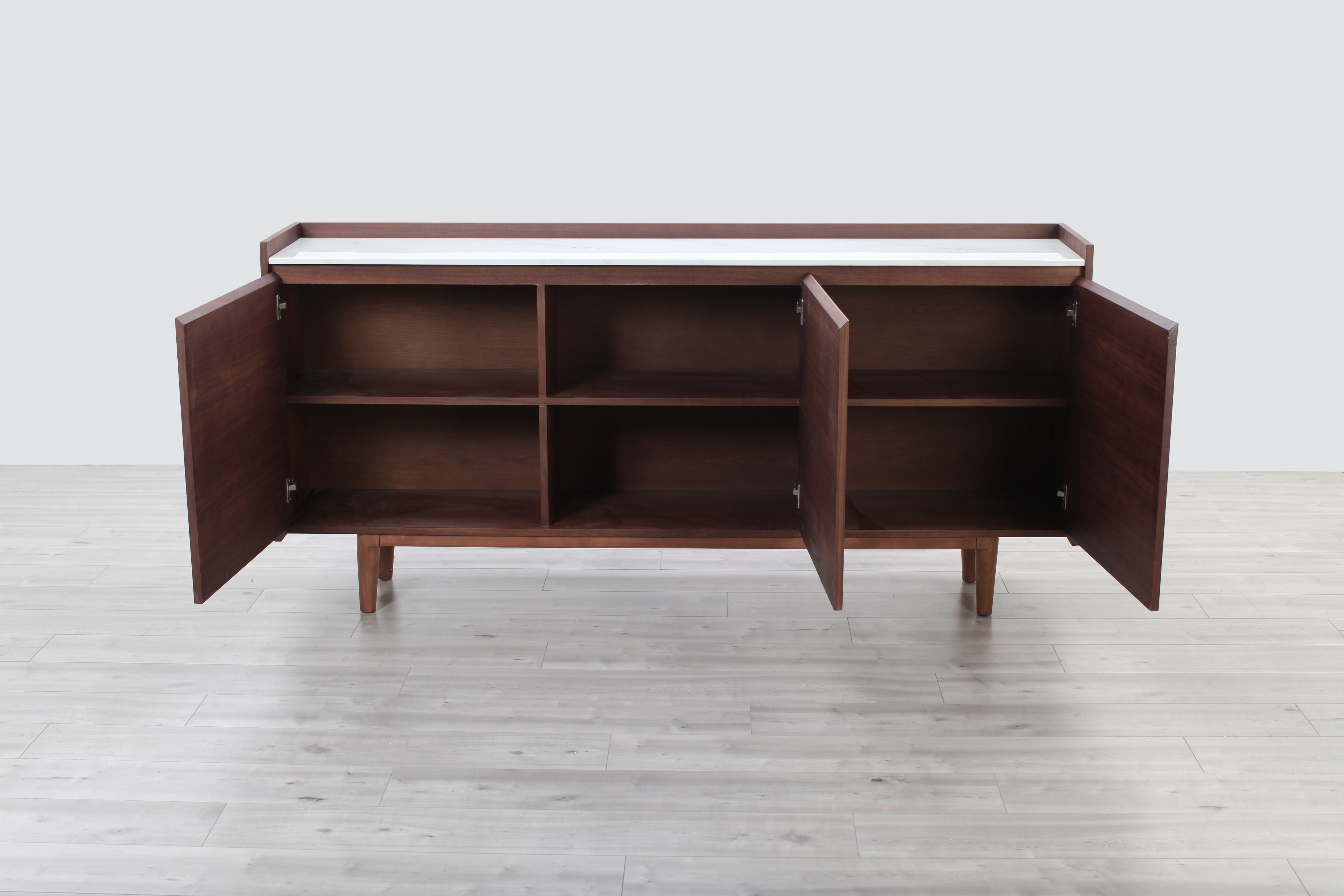 A welcome addition to any mid-century styled home, this sideboard constructed of MDF walnut veneer and equipped with soft closing drawers is the perfect definition of form and function. Ample storage is one thing, but it’s the beautiful solid natural marble top that makes this sideboard a head-turner in any room.