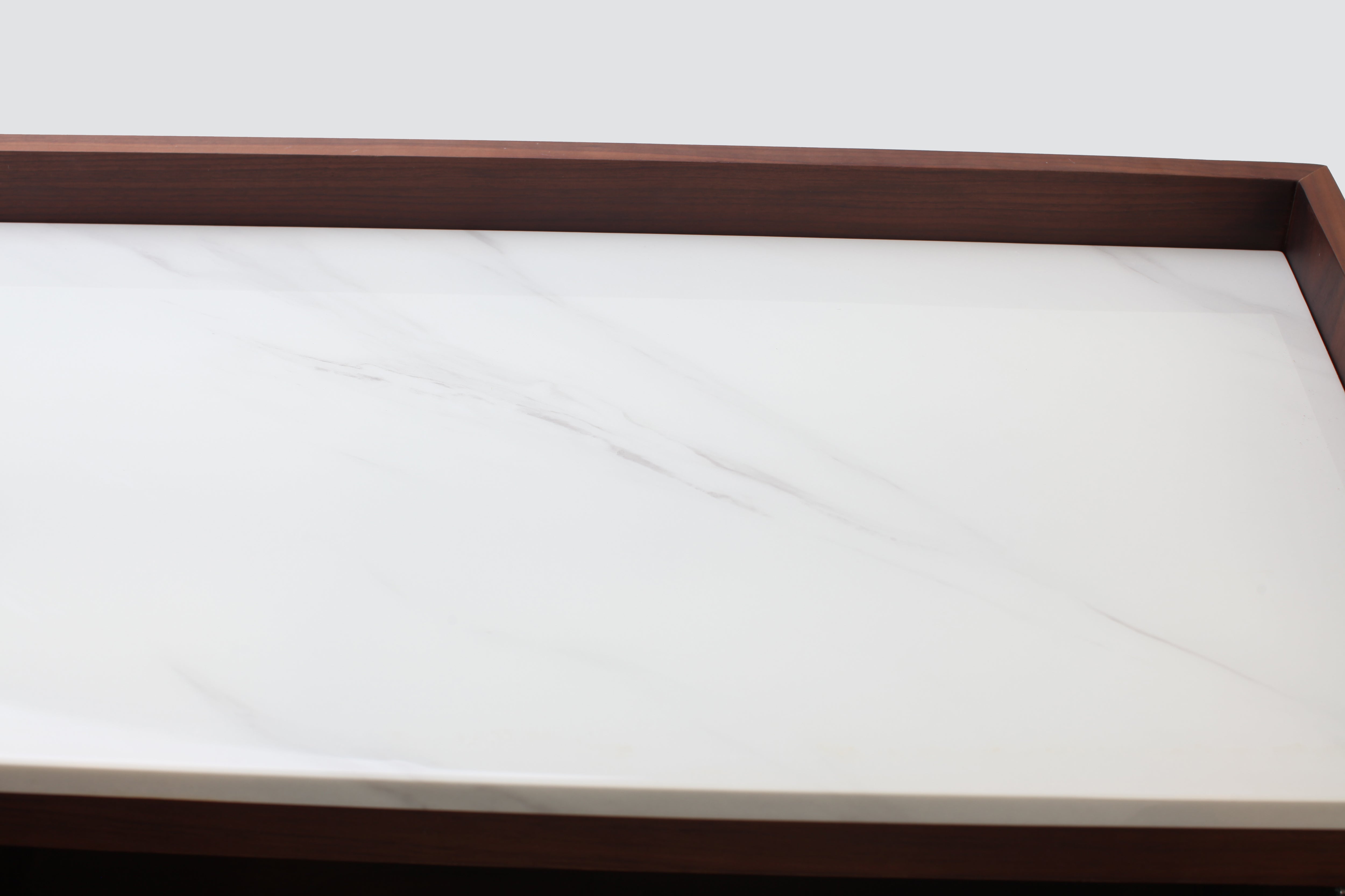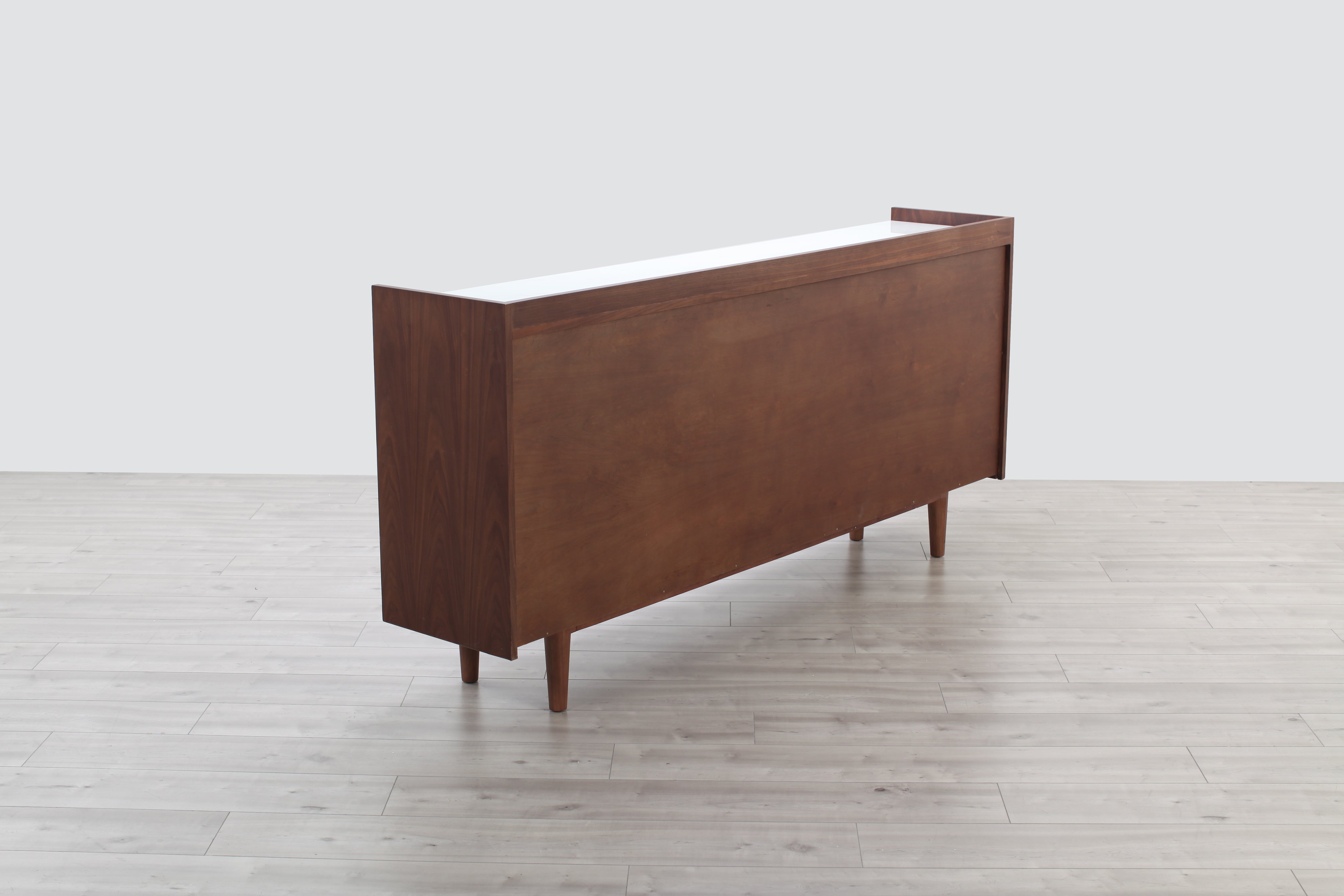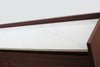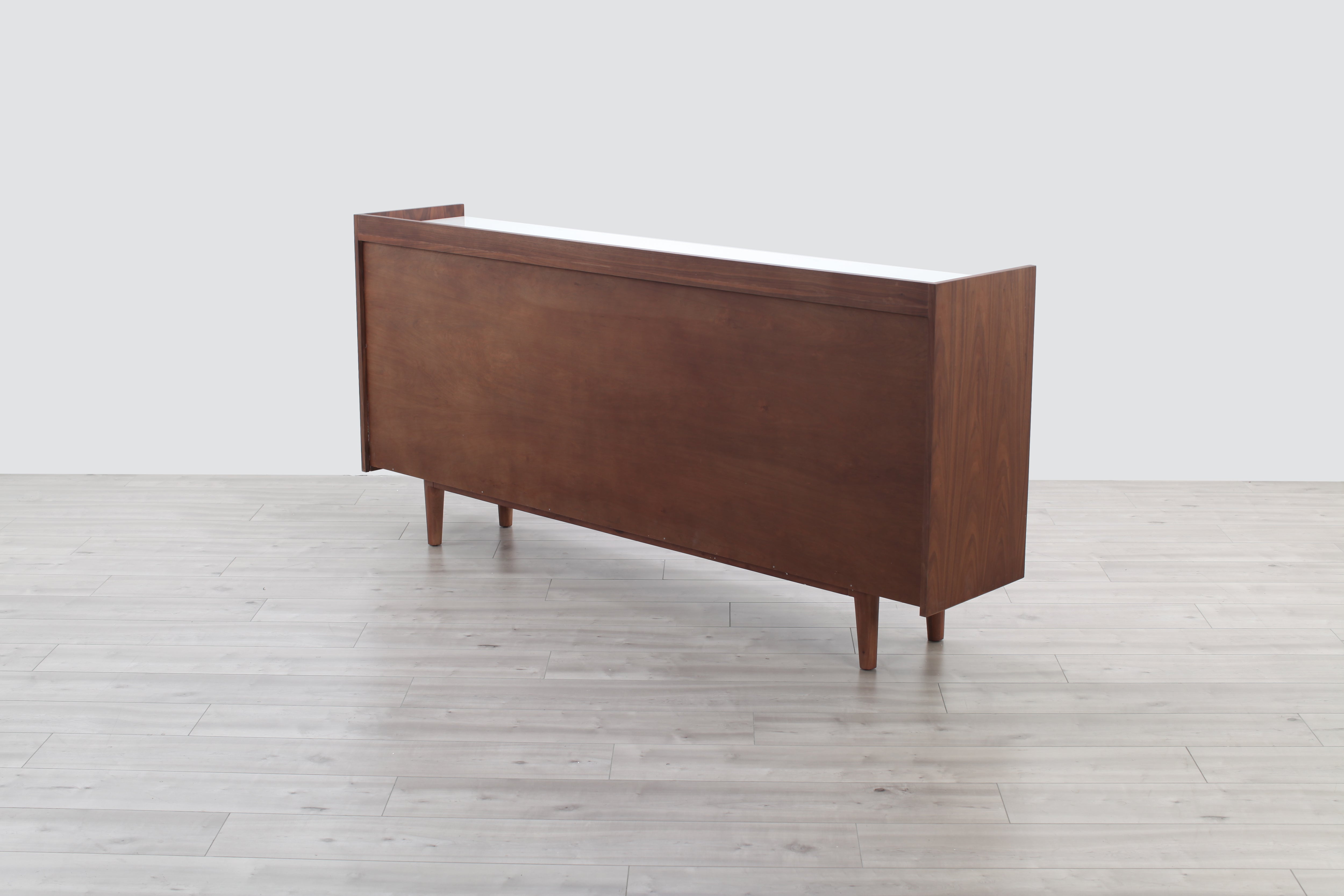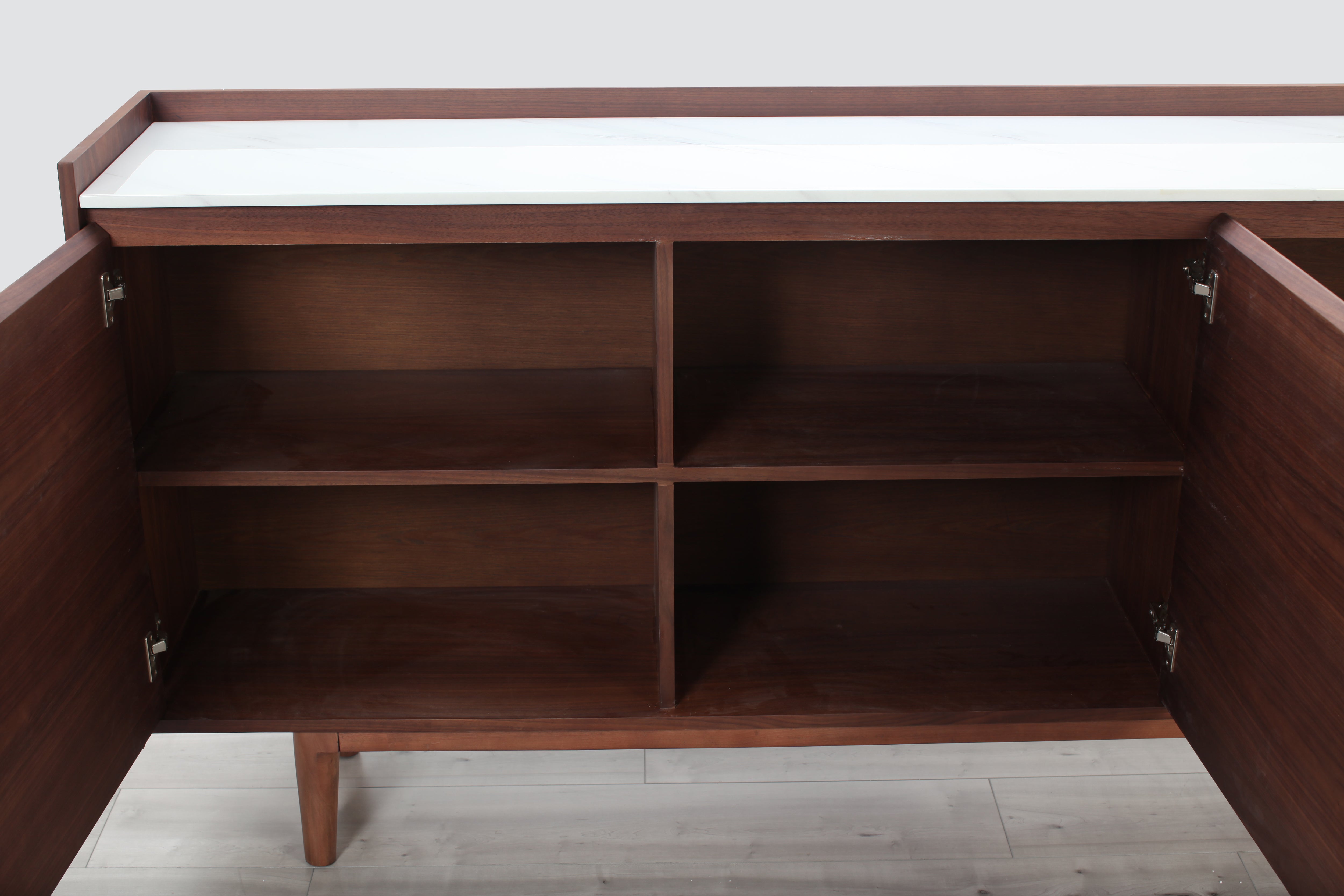 A welcome addition to any mid-century styled home, this sideboard constructed of MDF walnut veneer and equipped with soft closing drawers is the perfect definition of form and function. Ample storage is one thing, but it’s the beautiful solid natural marble top that makes this sideboard a head-turner in any room.