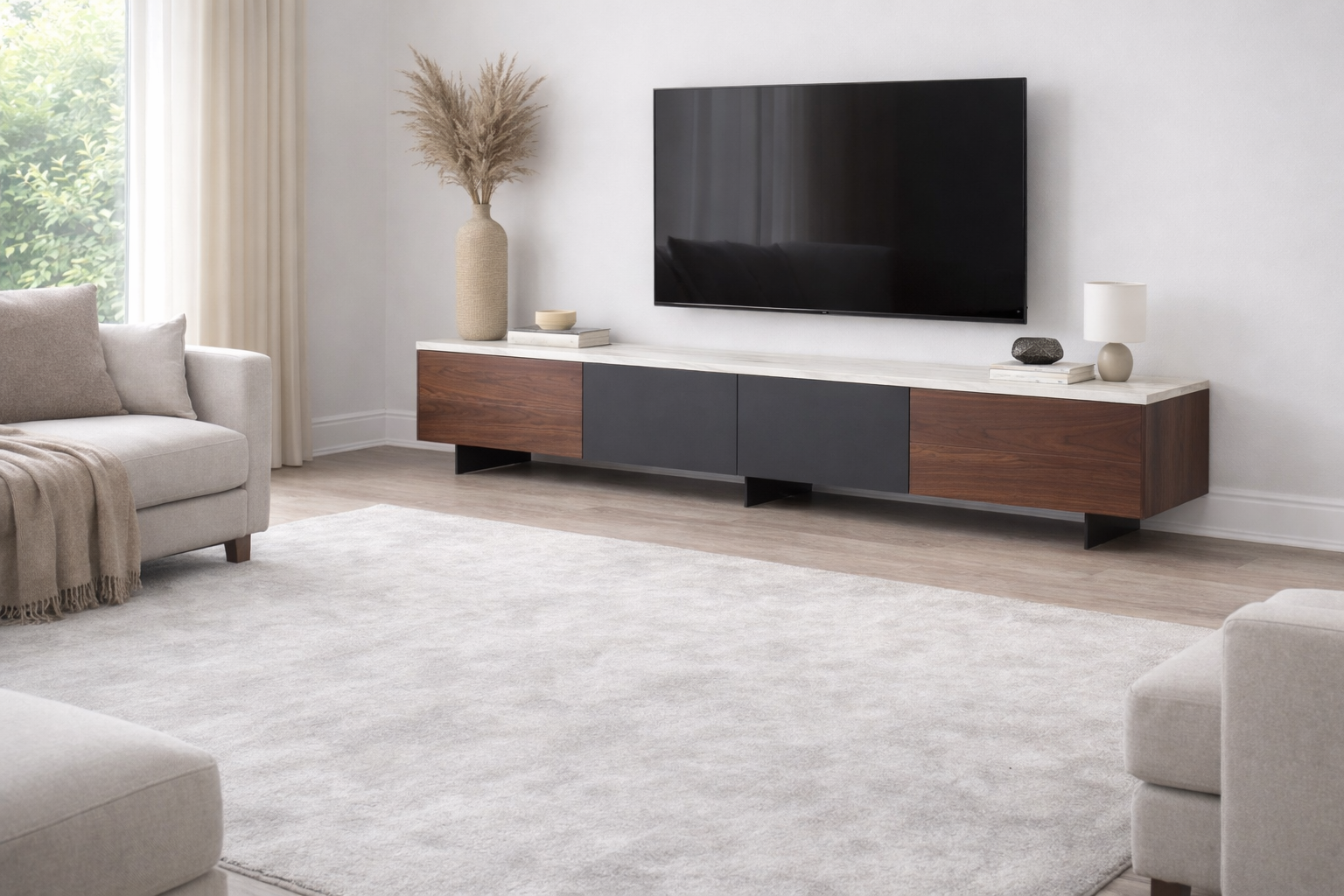 Complete your living room with this exquisite TV stand constructed of MDF and a warm walnut veneer with four push out drawers. It’s soft closing doors opens up to more then enough space to store all your audio and video needs. Finished with a luscious marble top that fits a large sized TV.